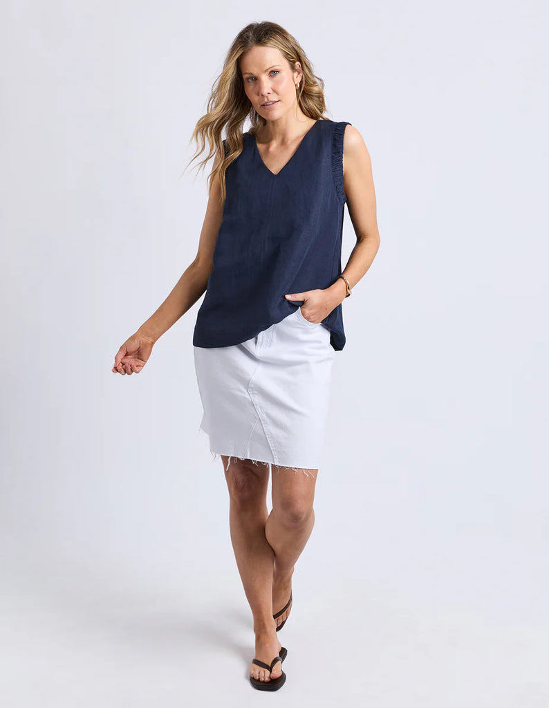 The Bermuda Top is all about relaxed summer vibes. With its linen blend feel, playful frill detail and clean V-neckline, it is a style that looks just as good dressed up as it does casual.