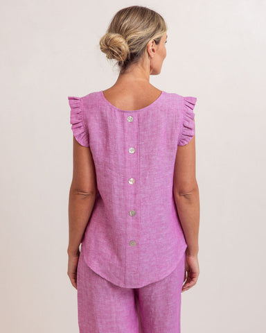 Elevate your wardrobe with this Linen/Viscose Ruffle Sleeve Button Back Top, combining breathable comfort with chic design. The lightweight linen and viscose blend ensures all-day ease, while the extended ruffle sleeves add a sophisticated, feminine touch. A stylish button-back closure and flattering scoop back detail create a modern, elegant silhouette. Perfect for both casual outings and dressier occasions, this top offers versatility and effortless style that enhances your everyday look. Experience the perfect blend of comfort and fashion with this standout piece.