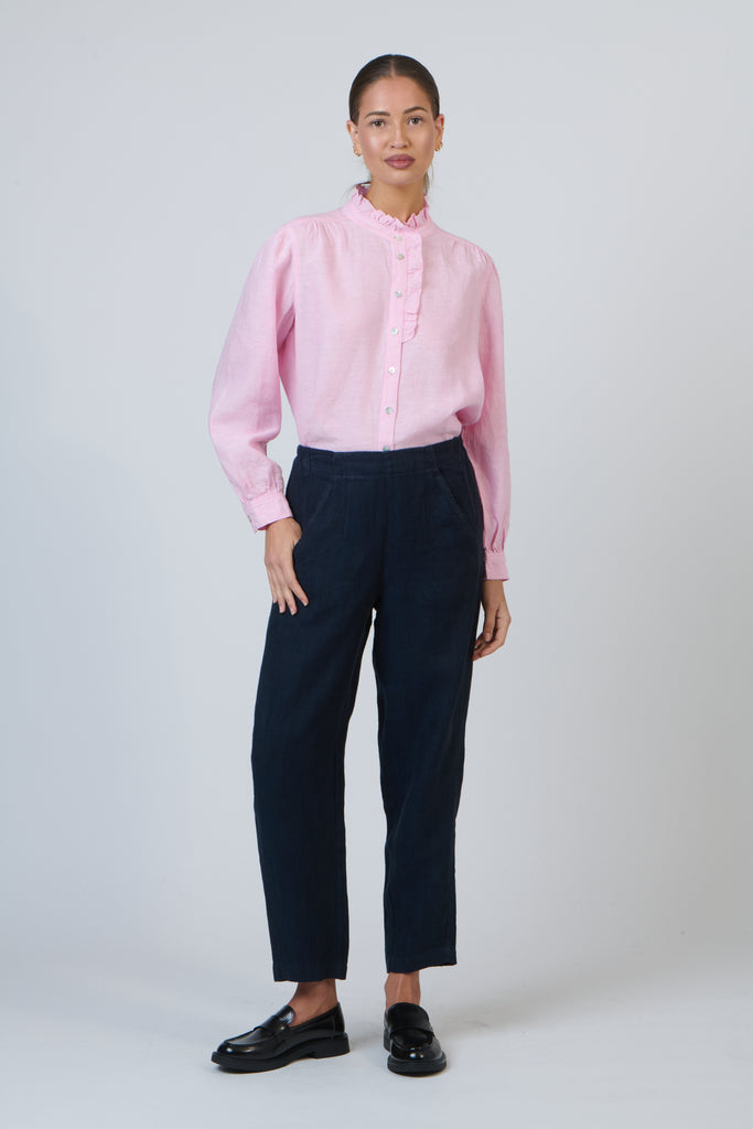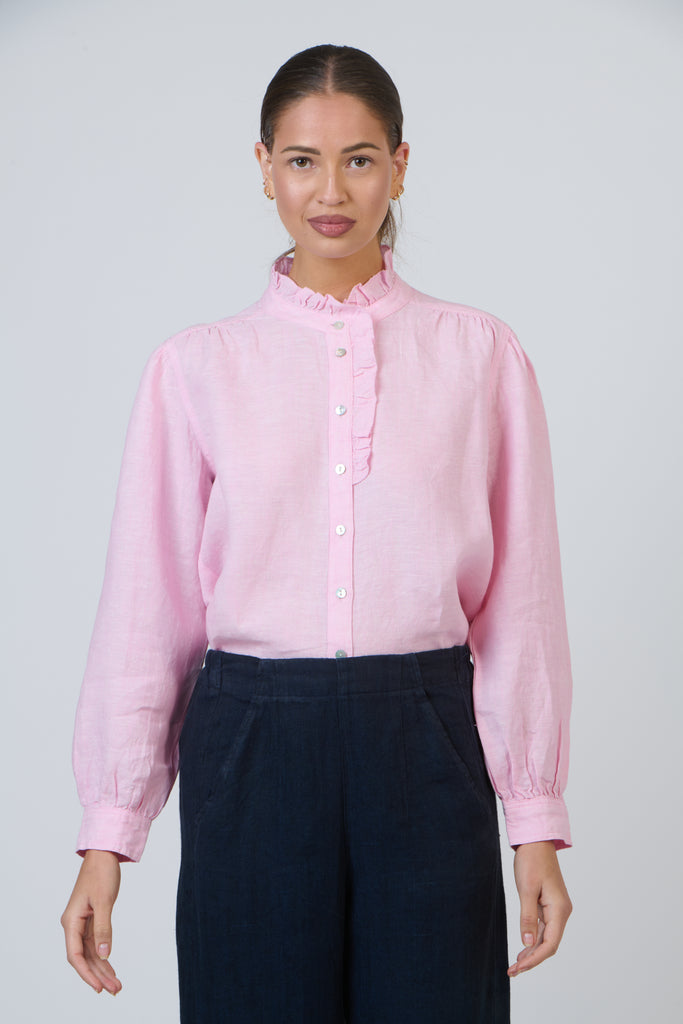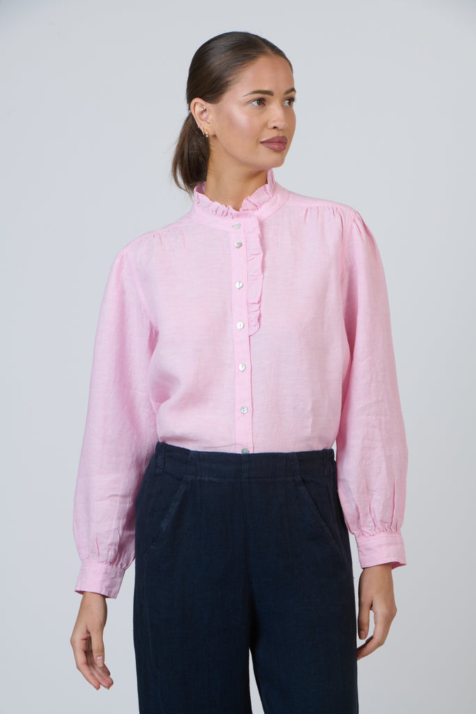Romantic and effortlessly graceful, this shirt brings a touch of vintage refinement to everyday dressing. The high ruffled collar and softly gathered yoke create a delicate silhouette, complemented by voluminous sleeves that finish in tailored buttoned cuffs. Its relaxed, hip-length shape drapes beautifully in breathable 100% linen — an elegant nod to Victorian-inspired femininity reimagined for the modern wardrobe.