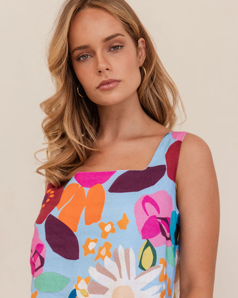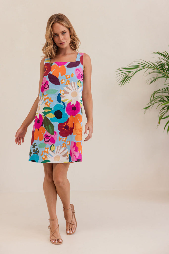 LINEN BLOOM BURST SQUARE NECK SHIFT DRESS