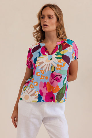 Elevate your wardrobe with the Linen Bloom Burst Top, crafted from breathable 100% linen for ultimate comfort and style. Featuring a flattering V-neck and thoughtfully designed shoulder detail seamlessly integrated into the seam, this top offers a polished and sophisticated look. The gorgeous colours enhance your outfit effortlessly, making it a versatile piece for both casual days and elegant evenings. Lightweight and breathable, it keeps you cool while adding a touch of refined charm to your everyday wear. Perfect for those who appreciate quality and subtle elegance in their clothing.