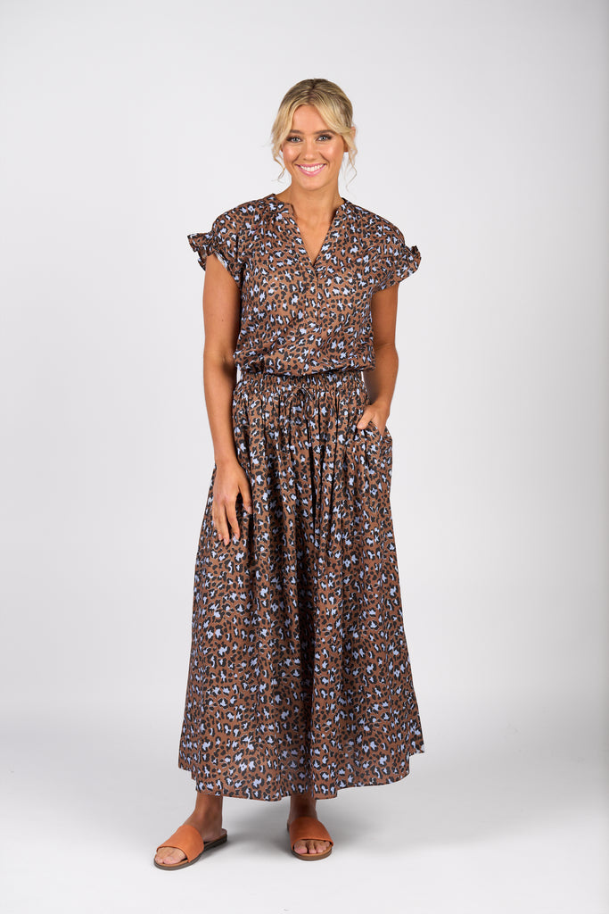 A full, wide maxi skirt made from soft, lightweight printed cotton for a breezy, comfortable feel. Designed with an elastic waistband and drawstring for an easy, relaxed fit. Works back well with pale blue.