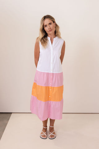 Experience effortless summer style with this gorgeous cotton tiered spliced dress, designed in a striking tango and white stripe pattern. Crafted from 100% breathable cotton, it keeps you cool on hot days while offering natural comfort. Practical pockets enhance its everyday functionality, and the bra-friendly cut ensures a perfect fit and confidence all day long. This dress is perfect for casual outings or beachside strolls, combining style and comfort for your warm-weather wardrobe. Embrace summer with sophistication and ease.