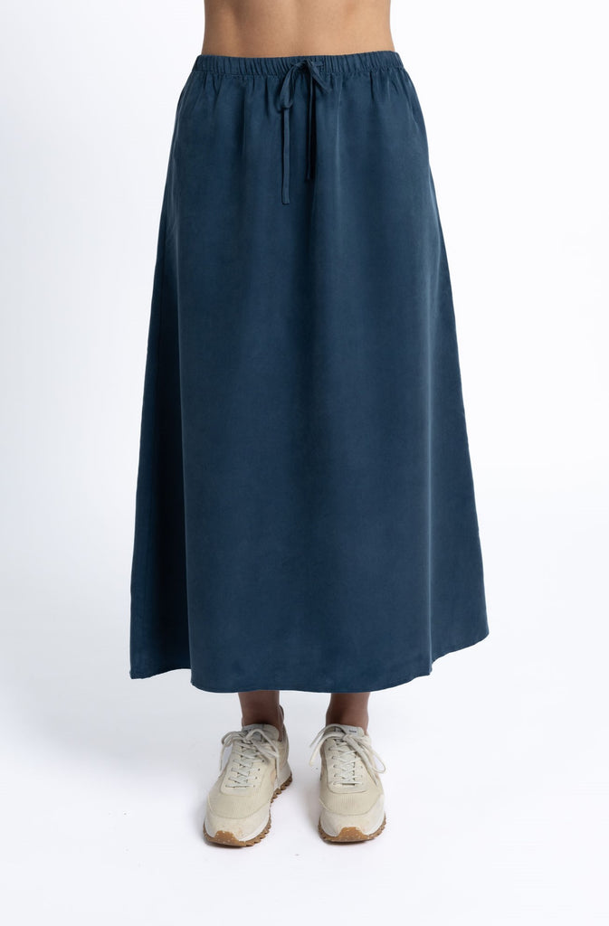 Our favourite stylish skirt for any occasion. The unique texture of our Cupro has a soft feel and velvety touch, bringing an effortless classiness to every piece. The official colour is navy, however I would say it is more of a dark teal colour.