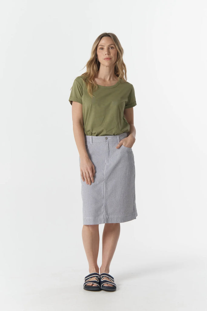 Our 5 Pocket Knee Length Skirt in navy and white is made from a yarn-dyed cotton stripe with a touch of stretch for comfort. With a classic five-pocket design and flattering straight cut, it’s an easy, versatile piece to pair with tees, shirts or lightweight knits.